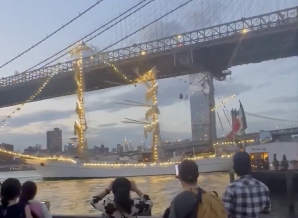 El Cuauhtémoc, el buque insignia de la Marina mexicana, que transportaba a 277 tripulantes, chocó contra el puente por razones aún sin aclarar, rompiendo los tres mástiles, una imagen que pudo ser grabada por numerosas personas con sus teléfonos móviles.