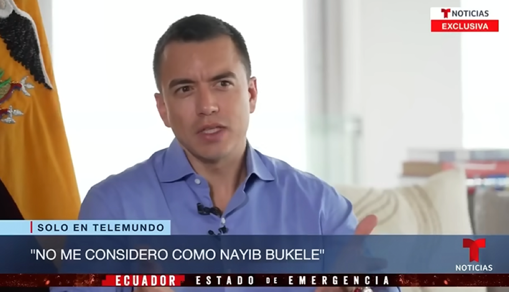 Al preguntarle qué opina sobre el presidente de El Salvador, Nayib Bukele, con quien lo comparan sus críticos, Noboa respondió que "como toda persona ha hecho cosas buenas, ha hecho cosas que no me parece que las ha hecho bien. Ha tenido éxitos, ha tenido fracasos".