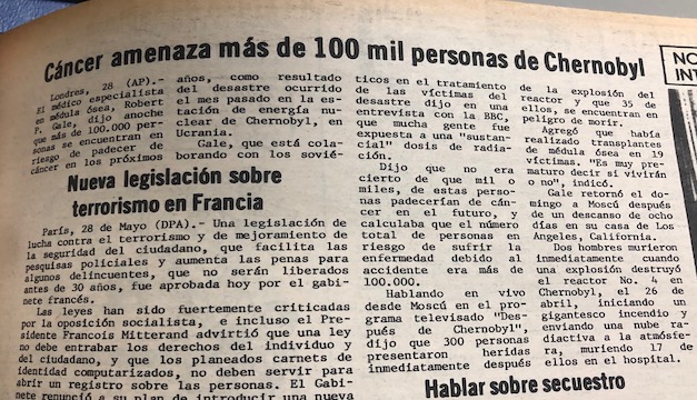 Las noticias continuaron llegando el 28 de mayo y ya se hablaba en la edición de Diario El Mundo de que el cáncer amenazaba más de 100 mil personas de los alrededores de la central nuclear.