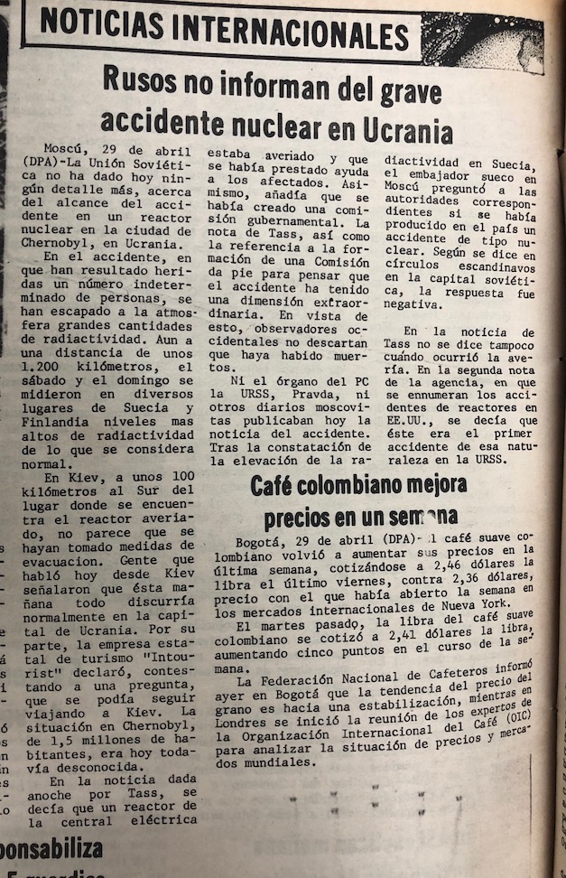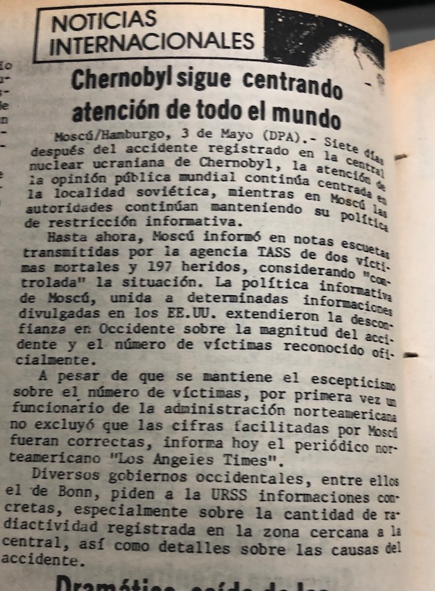La primera noticia se conoció tres días después. Diario El Mundo informaba al respecto en su portada del martes 29 de abril con el titular: "Accidente nuclear ruso el más grave de la historia". La noticia advertía sobre el escape radioactivo y se trataba de un reporte desde la entonces capital de la República Federal Alemana, Bonn.