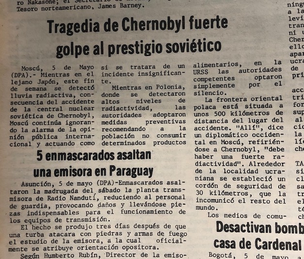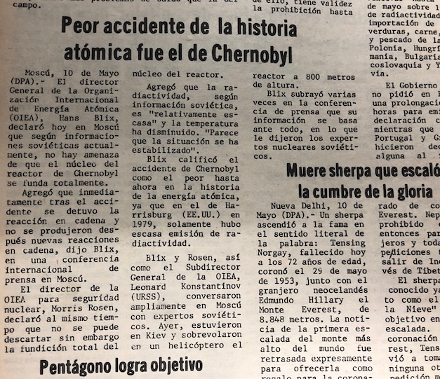 El 5 de mayo, Diario El Mundo revelaba que la lluvia radiactiva había alcanzado Japón y Polonia, mientras el régimen soviético continuaba ignorando las alarmas de la opinión pública internacional y trataba el hecho como "un incidente insignificante".