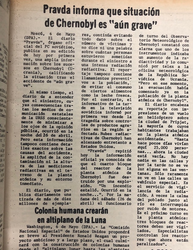 Un día después, citando al periódico moscovita Pravda, Diario El Mundo titulaba: "Pravda informa que situación de Chernobyl es aún grave". Fue la primera vez que la prensa soviética se refirió al respecto.