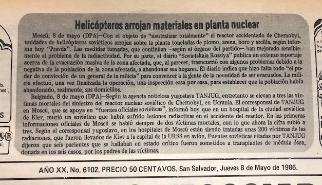 El 8 de mayo, Diario El Mundo informaba que "Helicópteros arrojan materiales en planta nuclear", con el objetivo de "neutralizar totalmente" el reactor accidentado y citaba la evacuación masiva de la población.