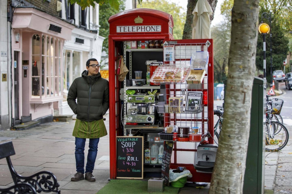 Abrir un comercio en una antigua cabina, alquilada a un propietario privado, le cuesta menos caro que un negocio en un local, añade el joven de 29 años, que comenzó con Walkmisu antes de abrir cerca un café.