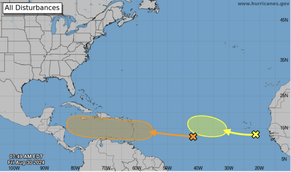 El Centro Nacional de Huracanes de los Estados Unidos (NHC, por sus siglas en inglés) advirtió este viernes que vigila dos ondas tropicales en el Atlántico, una de las cuales tiene una probabilidad media de convertirse en una depresión tropical en algún momento de la semana entrante mientras se mueve a través de las Antillas Menores y el Mar Caribe. Según el gráfico del NHC, la trayectoria parece dirigirse a Centroamérica.