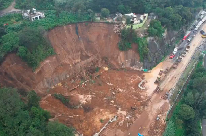 Un derrumbe de grandes proporciones obstaculizó los cuatro carriles de la carretera que del municipio de Fraijanes, Guatemala, conecta con El Salvador.