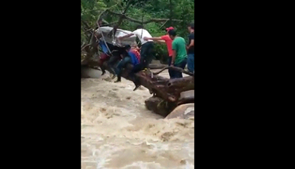 Un video que se popularizó en la red social Twitter, muestra a pobladores del departamento de Santa Bárbara, en Hondura, poniendo en riesgo su vida al transportar un ataúd mientras cruzan un fuerte caudal.