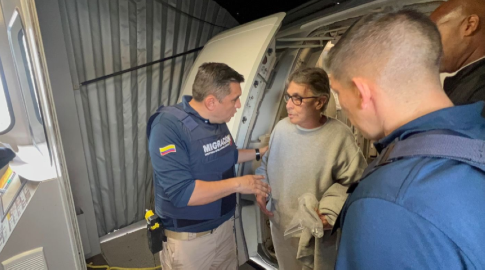 Sin cuentas pendientes con la justicia de su país, el excapo de 67 años aterrizó en el aeropuerto de Bogotá vistiendo una sudadera, según una fotografía divulgada por Migración Colombia en la red X.