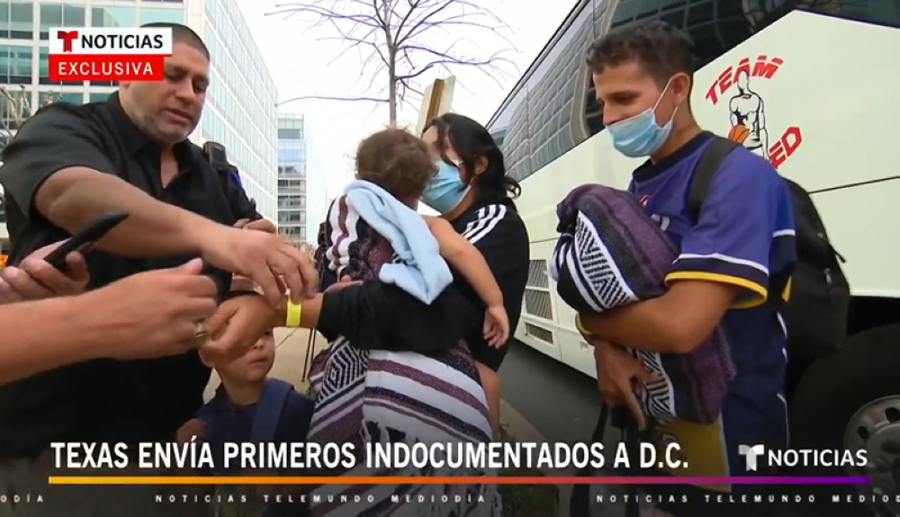 Caridades Católica en Washington DC recibe el primer bus con migrantes enviados desde Texas. Telemundo