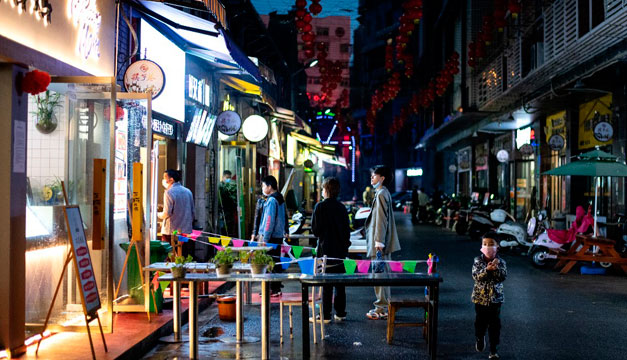 En una calle comercial decorada con farollilos rojos, un grupo de repartidores espera los pedidos frente a un restaurante. Pero hay pocos clientes y de todas maneras tampoco está permitido comer en el interior.