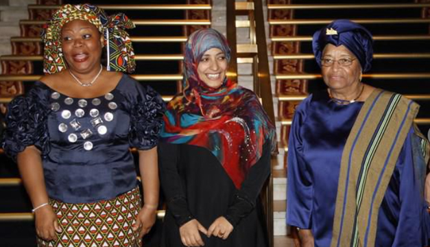 Ellen Johnson Sirleaf (Liberia), Leymah Gbowee (Liberia) y Tawakkol Karman (Yemen) por su lucha no violenta en favor de la seguridad de las mujeres y de sus derechos a participar en los procesos de paz.