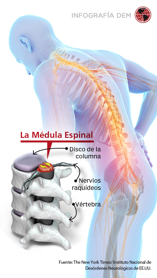 Este padecimiento suele comenzar con un dolor en la zona lumbar, debilidad muscular o sensaciones anormales en los dedos de los pies y los pies, y luego aparecen otros síntomas más graves como por parálisis, retención urinaria y pérdida del control intestinal, precisa el instituto.