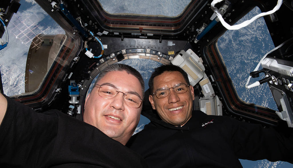 Los astronautas Kjell Lindgren y Frank Rubio posan juntos para un retrato dentro de la cúpula en la EEI. NASA