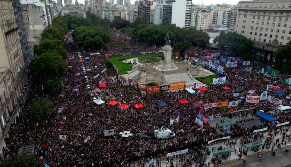 Las manifestantes protestaron por mantener el derecho al aborto y contra la violencia machista, la trata de personas y los ajustes económicos que lleva adelante el mandatario ultraliberal, en un contexto de más de 250% de inflación interanual y con una pobreza que afecta a más de la mitad de la población.