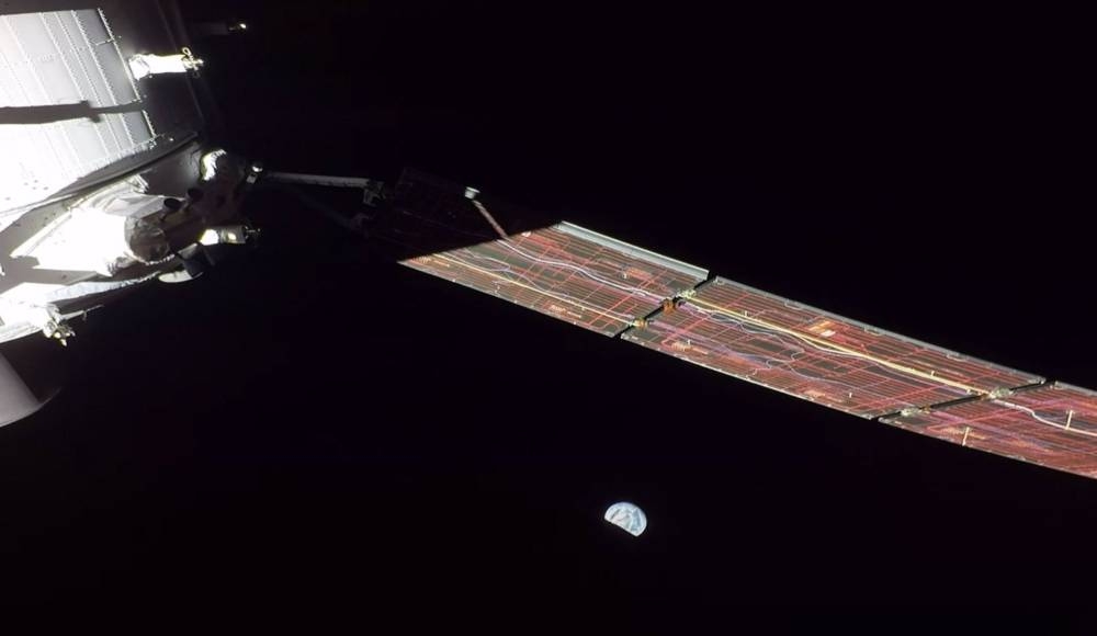 La Tierra se eleva por detrás de la Luna en este video capturado por una cámara en una de las alas del panel solar de la nave espacial Orion de la NASA en misión a la órbita lunar.