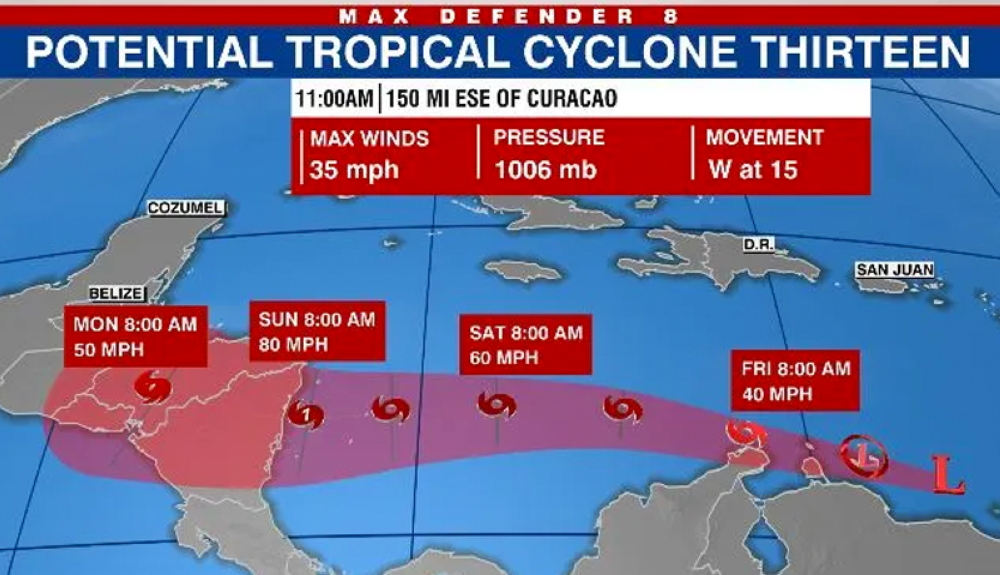 Aunque podría ser una de las últimas amenazas de la temporada de huracanes del Atlántico, la depresión tropical 13 inquieta principalmente a los países del norte de Centroamérica a donde comenzará a tocar tierra cuando “el sistema que se convierta en un huracán para el sábado en la noche mientras se acerque a las Islas de San Andrés y Providencia”, frente a la costa Este de Nicaragua.