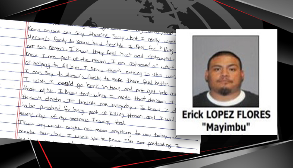 En la carta manuscrita presentada el lunes poco antes de conocer su sentencia en una corte de Boston, López Flores le dice a los padres de Herson Rivas: “Quiero que la familia de Herson sepa lo mal que me siento por matar a su hijo”, “me avergüenzo de lo que hice al ayudar a matarlo”, y prosigue: “Sé que merezco ser castigado por ser parte del asesinato de Herson y cumpliré todos los días de mi sentencia sabiendo eso”.