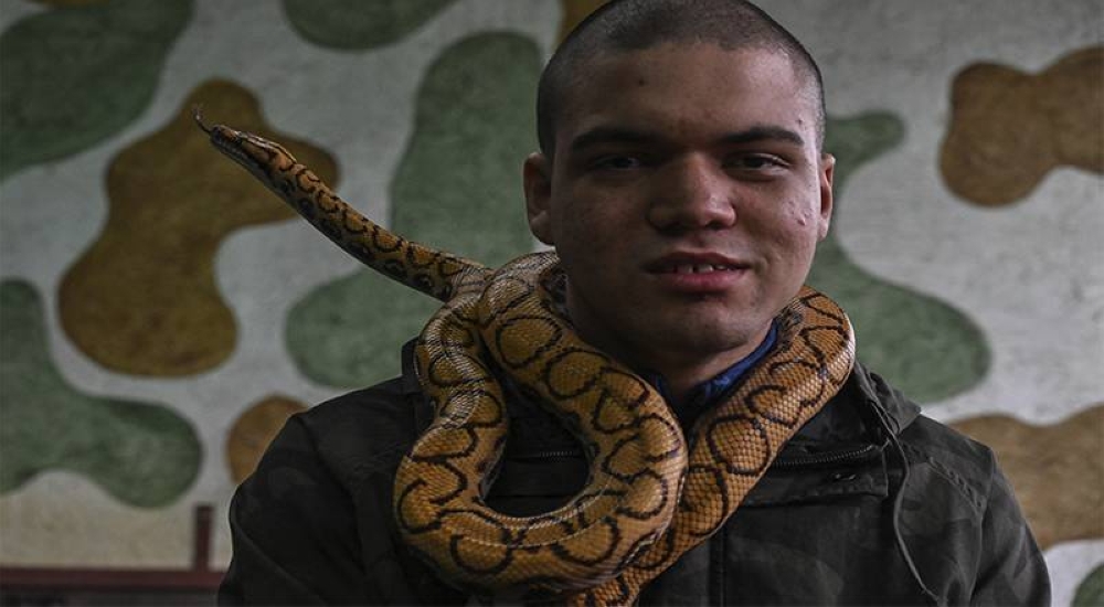 "Se llama Gold, está fría, come ratones", dice David, desafiado por la terapeuta Andrea Ribeiro a describir la boa constrictora que se arrastra por su campera con estampa de camuflaje.