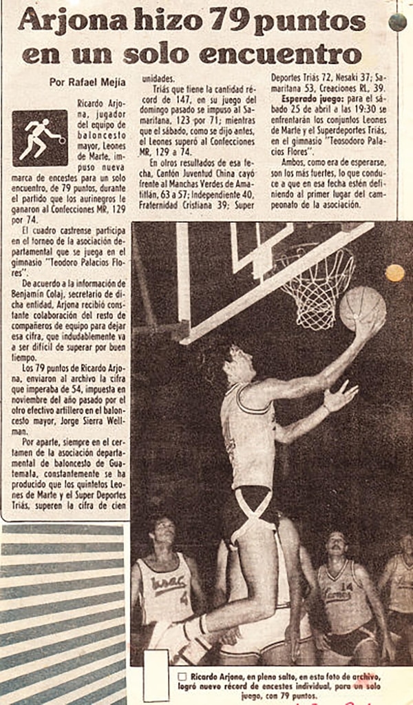 Arjona fue un reconocido basquetbolista, perteneció al equipo Leones de Marte, selección de su natal Guatemala, con quien marcó un récord que mantuvo durante 18 años: anotó 79 puntos en un solo partido, en abril de 1987, marca que fue superada hasta el 2005. Su faceta deportiva la inició en la escuela, donde jugaba de alero bajo y alero tirado, según declaró su exentrenador al medio guatemalteco Prensa Libre.