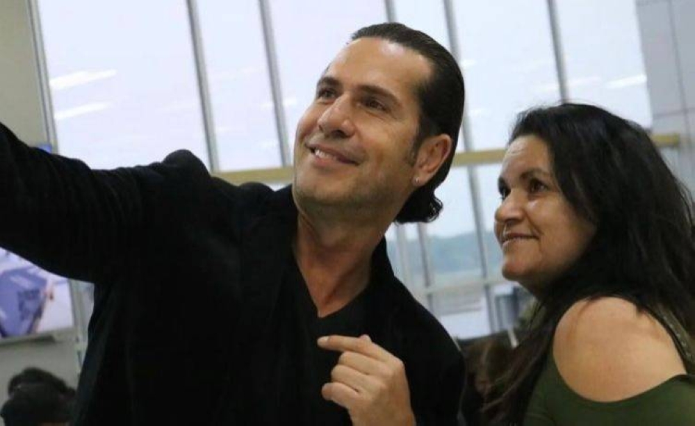 El astro, recordado por sus seguidoras por su personaje machista y galante, fue recibido por presentadores de Canal 21 y algunas fans que lo reconocieron y aprovecharon para tomarse unas selfies en el Aeropuerto Internacional Monseñor Romero.