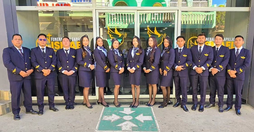 Funerales y Capillas Ismael Guzmán en el distrito de Sensuntepeque, Cabañas, ofrece un servicio único y original: un cortejo fúnebre conformado por jóvenes vestidos como tripulación aérea, quienes acompañan al difunto hasta su última morada sin costo extra.