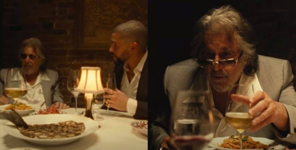 ¿Y dónde sienta? En una mesa junto al actor Al Pacino, el popular jefe de la mafia en su rola de la película "El padrino". Su mítico personaje de criminal galante convirtió a Pacino en una estrella y Bad Bunny quiso rendir homenaje a este clásico.