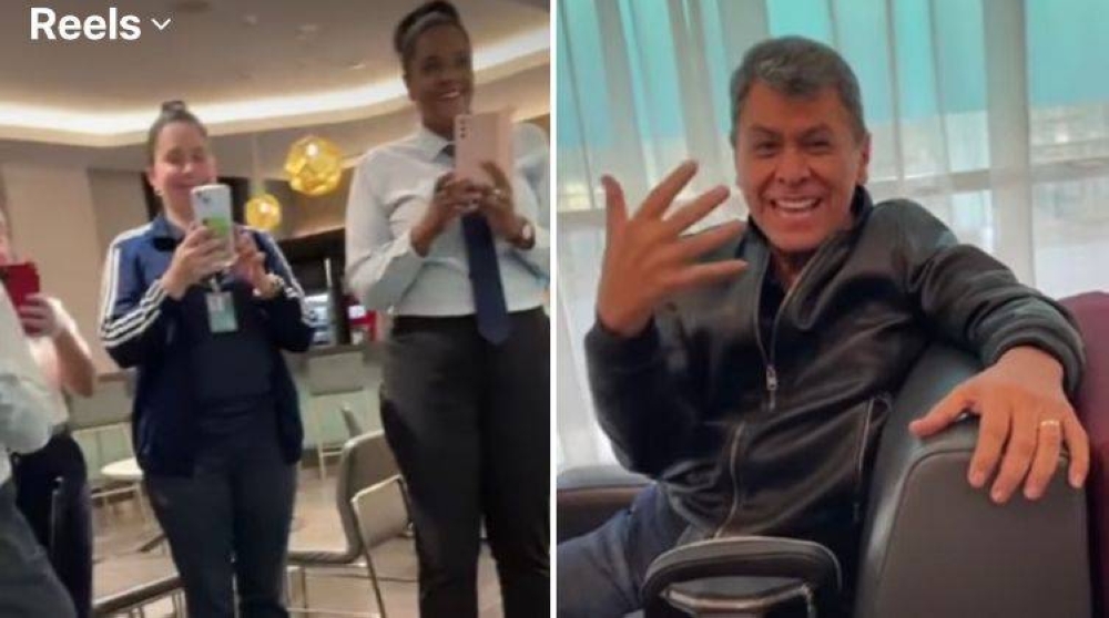 Una vez más, el cantante salvadoreño Álvaro Torres, demostró que es toda una figura aclamada en el extranjero. Esta vez, el artista tuvo un retraso en su vuelo de Miami hacia Chile, por lo que debió esperar en lo que parece un área VIP del aeropuerto estadounidense, y fue ahí donde el personal lo rodeó para saludarlo y grabarlo cantando sus melodías.
