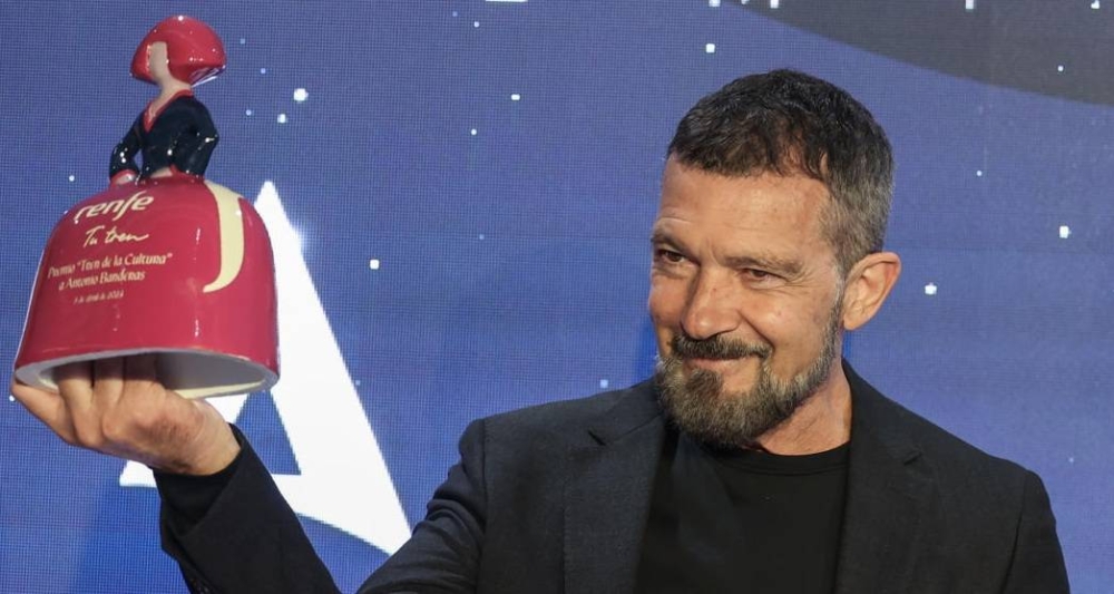MADRID, 08/04/2024.- El actor Antonio Banderas (i) recibe su premio acompañado por el presidente de RENFE Raúl Blanco Díaz (d) en el encuentro de nominados de la II edición de los Premios Talía de las Artes Escénicas de España, este lunes en Madrid. EFE/ Kiko Huesca