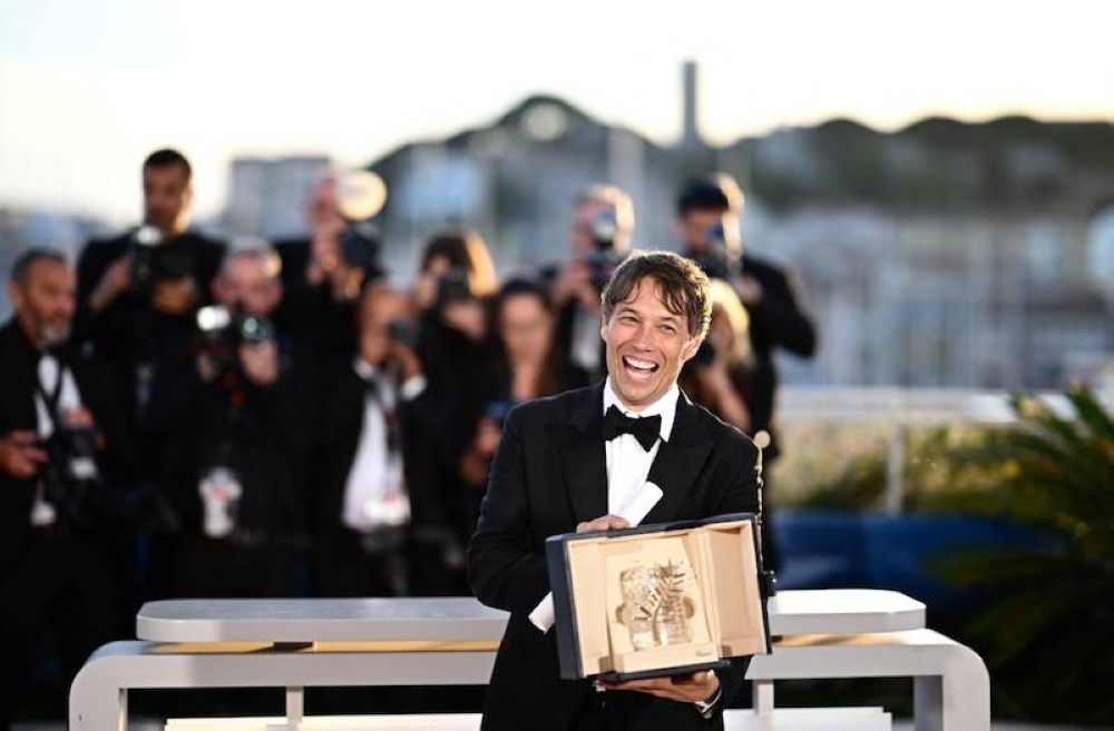 El director estadounidense Sean Baker posa con e trofeo tras ganar la Palma de Oro por su filme "Anora" en el Festival de Cannes este sábado en Francia./ AFP