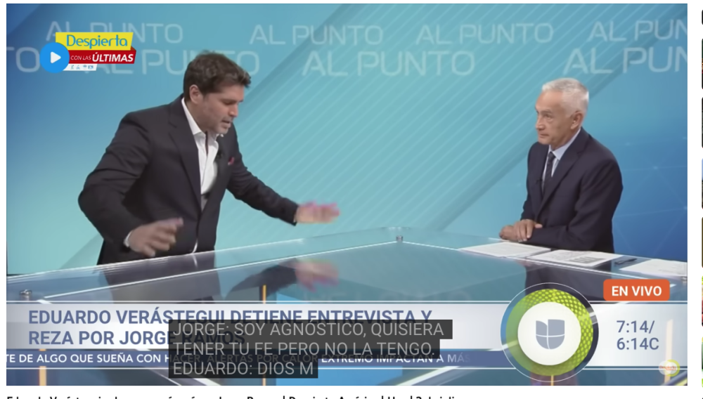 Entonces el actor cerró sus ojos y pidió a Dios como buen católico: “Manifiéstate en él que es un hombre bueno, Jorge es un hombre bueno, no quiero pensar en lo que haría si tú estuvieras en su corazón y él te deja entrar”, dijo Verástegui, para luego pedir una disculpa. Ramos agradeció y respetó su gesto.