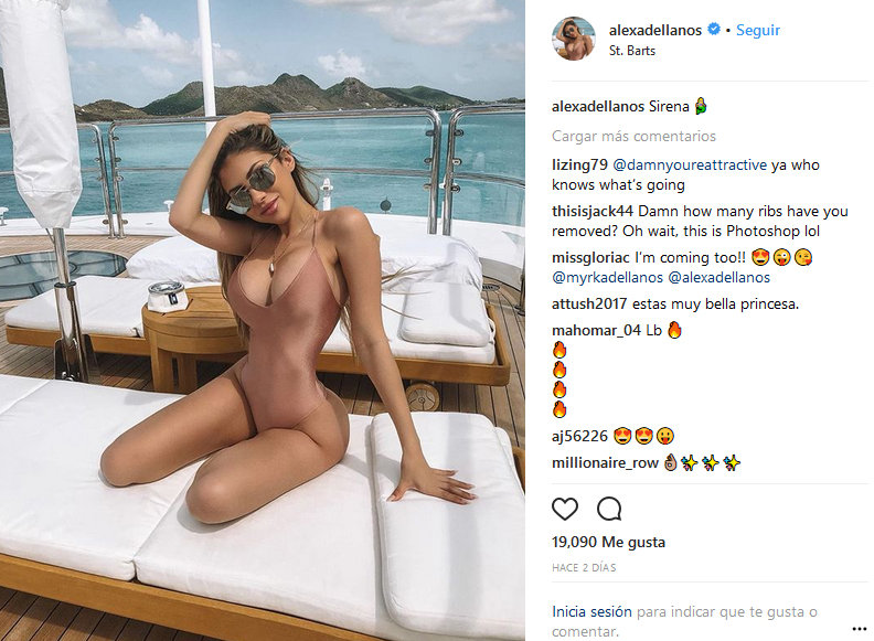 En una de las imágenes aparece sentada en un yate, con un traje de baño de una pieza, que resalta su pronunciado escote y su pequeña cintura. Algunos creen que la foto está retocada y no pasaron por alto ese posible detalle.