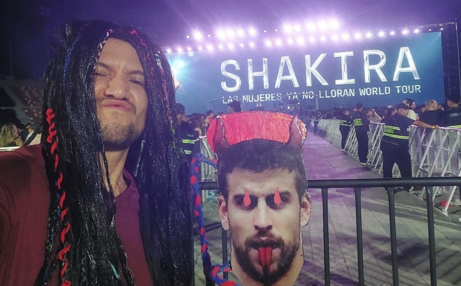 Pero un fan hizo de las suyas al enfundarse en un look especial que recordaba a las trenzas de Shakira en su etapa de «Ciega, sordomuda» y «¿Dónde están los ladrones?», las cuales ató a un cartel con la cara de Gerard Piqué con ojos incandescentes y al parecer también un lado con el rostro de Clara Chia Martí, la mujer española por la que él dejó a la cantante.