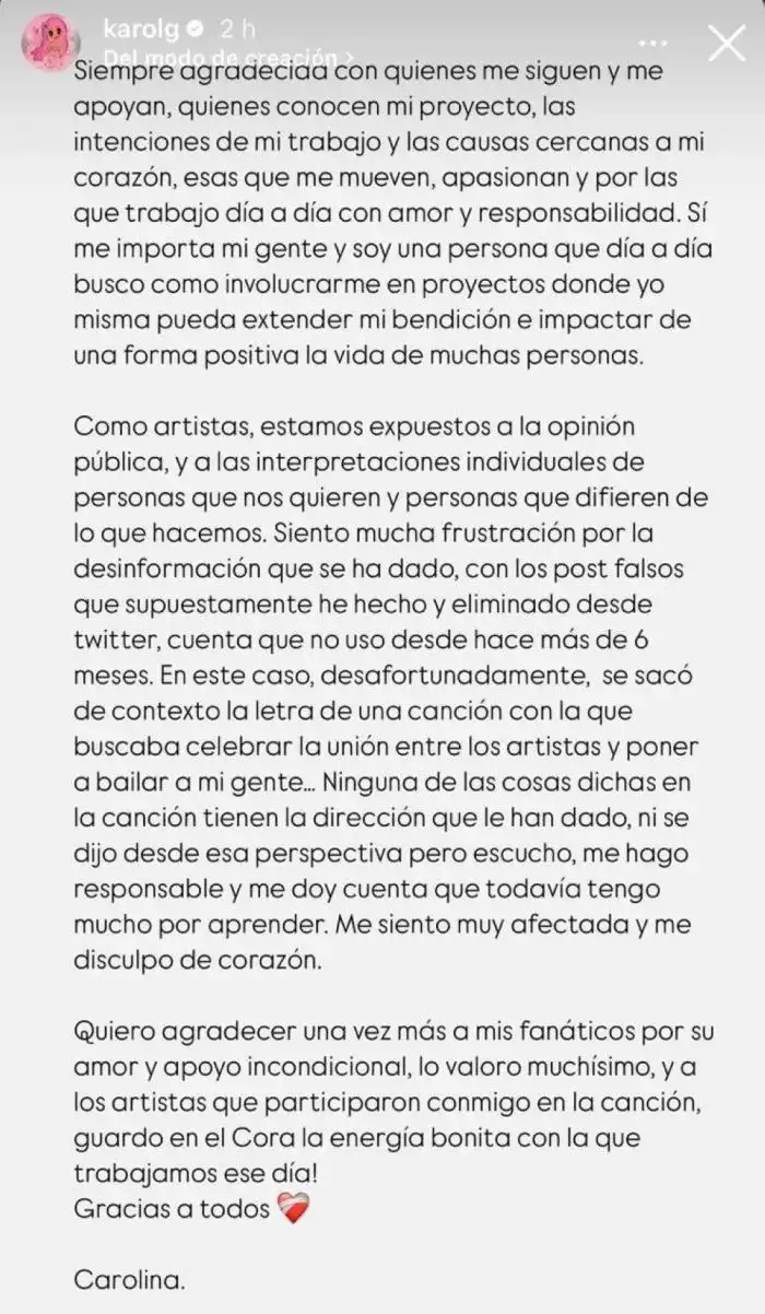 Hasta el momento, solo la cantante Karol G, de 33 años, ha emitido un comunicado a través de sus redes sociales mencionando que la letra de la canción se sacó de contexto y que aún así se responsabiliza del escándalo.