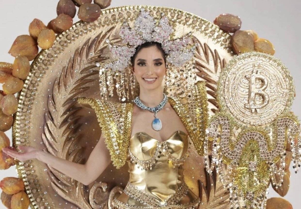 La representante de El Salvador Alejandra Guajardo sorprendió a todos luciendo un traje inspirado en las monedas salvadoreñas a lo largo de la historia entre las que destacó el Bitcoin.