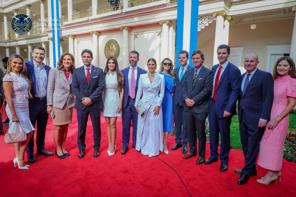 La embajadora de El Salvador en Washington, Milena Mayorga, en un exquisito traje blanco, acompañando al elegantísimo grupo del actor Eduardo Verástegui y Donald Trump Jr.
