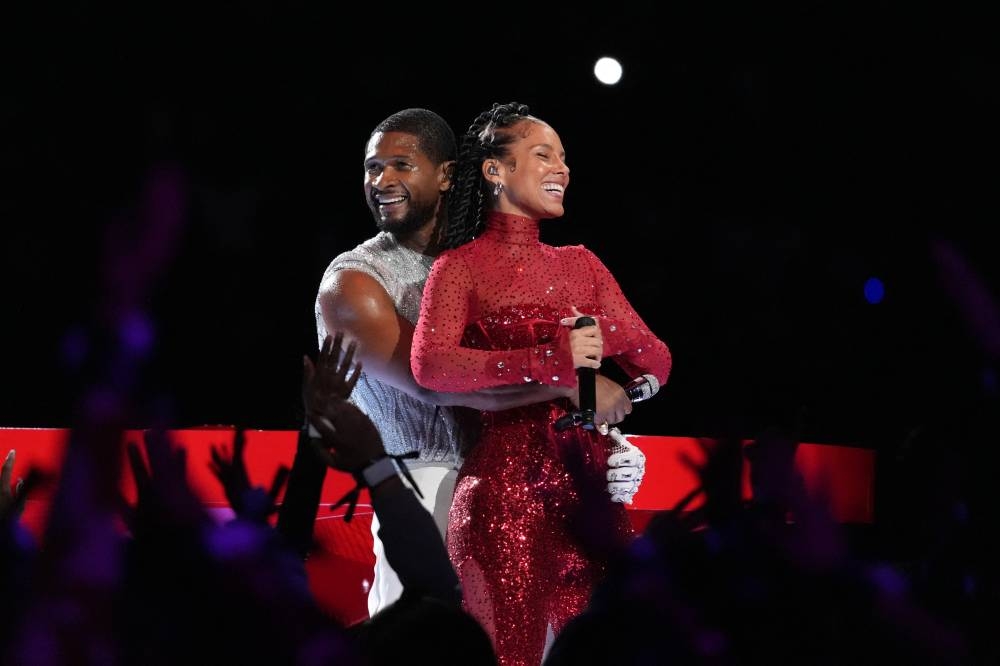 Los cantantes estadounidenses Usher y Alicia Keys se acercaron los cuerpos de manera muy sensual durante el espectáculo del medio tiempo del Super Bowl, este domingo en Las Vegas, lo que de inmediato causó reacciones entre los fans de la cantante, quien está felizmente casada con el rapero Swizz Beatz.