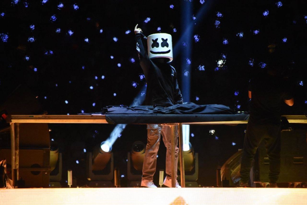 Eran las 9:33 de la noche cuando miles de almas hicieron un grito colectivo y hondearon sus pulseras de luz inteligente para dar la bienvenida al músico y productor enmascarado Marshmello, cuyo nombre real es Christopher Comstock, con su canción "Happier". El artista desplegó un set electrónico, que incluyó éxitos como "Friends", "Wolves", "El merengue" con Manuel Turizo.