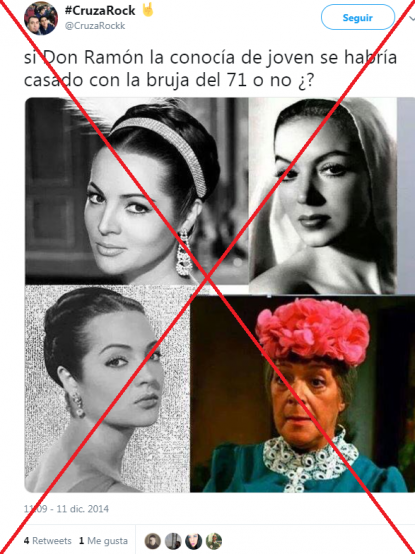 En las redes sociales se viralizaron fotografías en blanco y negro que aseguraban era de la actriz mexicano-española Angelines Fernández, mejor conocida por el personaje de la “Bruja del 71” de “El Chavo del 8”, a sus 22 años. Pero los fotogramas antiguos en realidad muestran a otra actriz, la española Sara Montiel. Algunos otros muestran a María Félix.