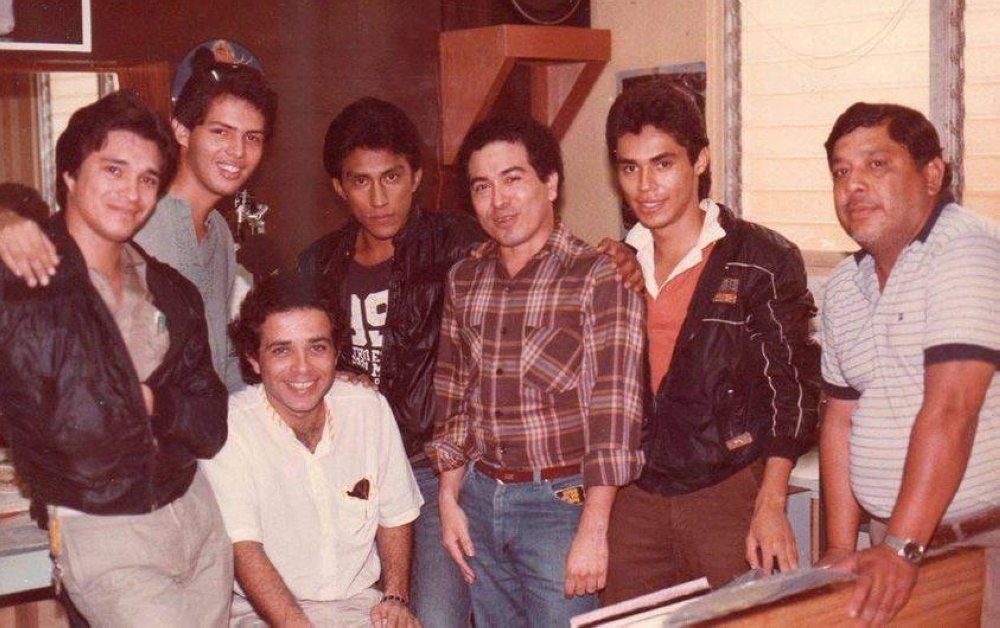 De izquierda a derecha aparecen Glauco, actual director de radio La Qué Buena y alguna vez reportero del programa "Domingo para Todos" (canal 2), sentado y de visita el cantautor chileno Fernando Ubiergo, Marlon Rolando (El Pantero), Antonio Mineros, expresentador del noticiero "Hechos" (TV 12 Azteca), ahora residente en Estados Unidos; Mario Meléndez, Marlon Eduardo (cantante, hoy residente en EE.UU.) y el empresario santaneco Manuel Montes.