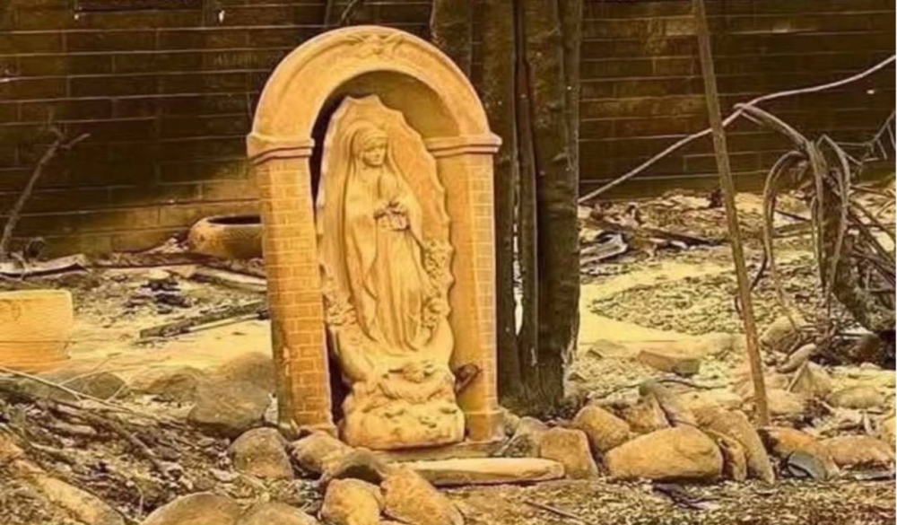 Asimismo, en la intersección de Mountain View y Olive Avenue, también en Pasadena, se encuentra una escultura del Sagrado Corazón de Jesús que, a pesar del incendio, permanece intacta frente a una casa. La figura parece aguardar pacientemente el regreso seguro de su familia.