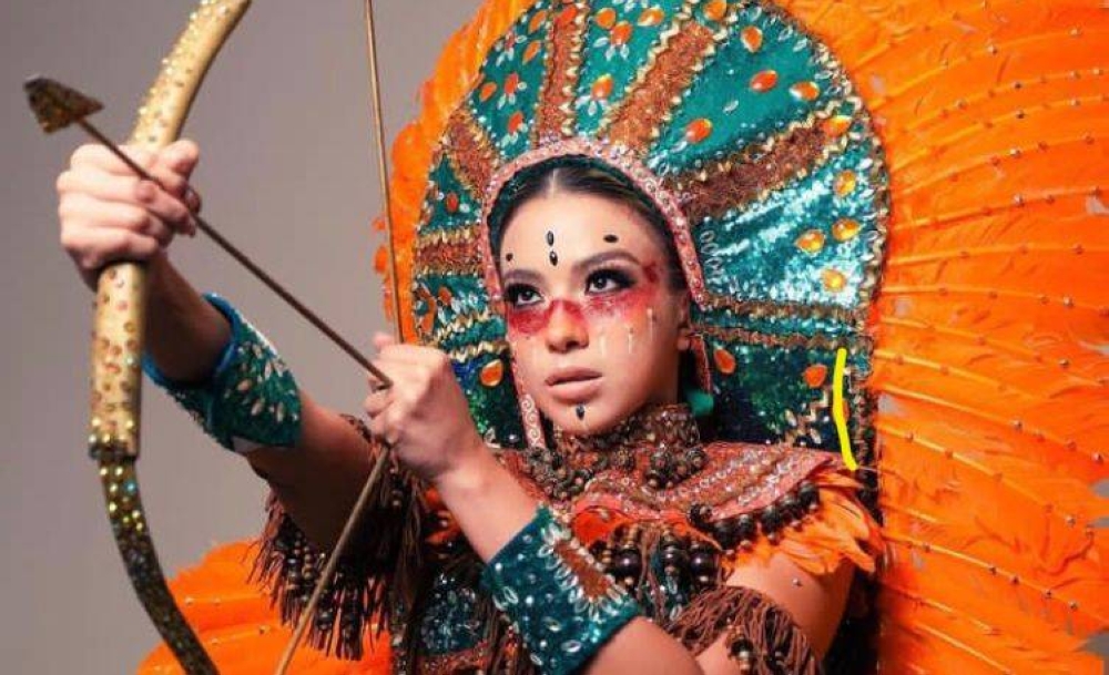 Con un penacho alegórico en color naranja, la bailarina y modelo se lució muy segura en una pasarela que acompañó con un arco dorado. Y es que la hija del presentador Billy Calderón representó la leyenda del indio Atlacatl, en su valiente defensa del territorio precolombino ante el conquistador español Pedro de Alvarado.