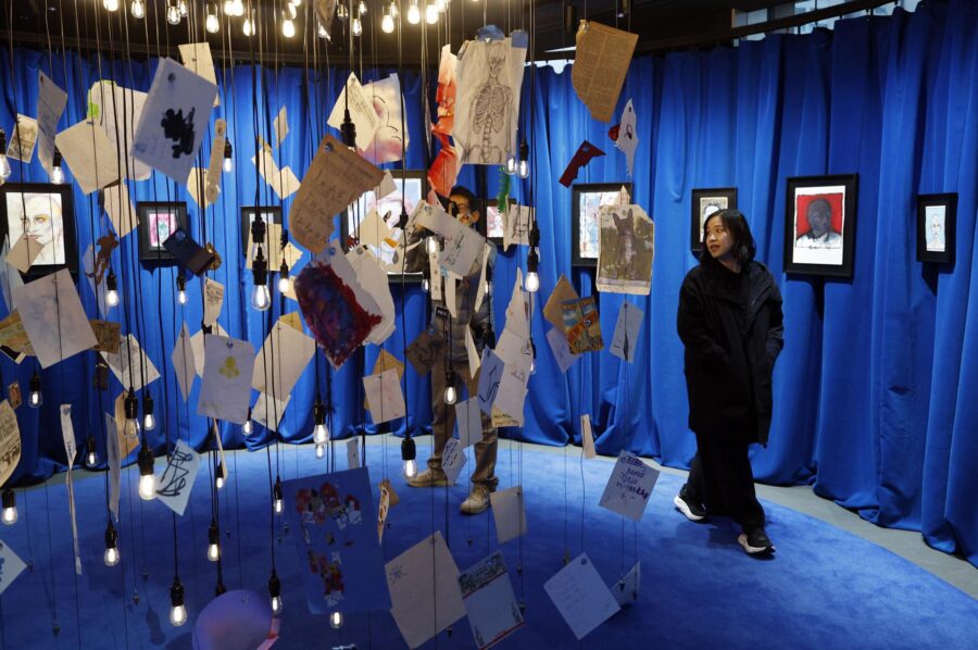 Una segunda sala, teñida de azul, reúne objetos de lo más diverso colgados del techo. Plumas, postales y notas escritas en hojas de libretas de hotel tendidos sobre el espacio para rendir homenaje al propio título de la exposición: un montón de cosas.