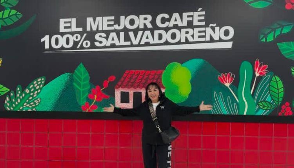 La comediante de 75 años compartió esta mañana una foto en su cuenta de Instagram, donde posa en un área del aeropuerto internacional de El Salvador, con un mural que reza "El mejor café 100% salvadoreño".