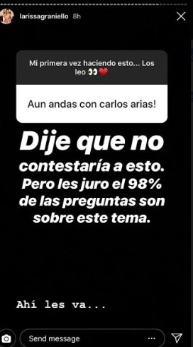 La exreina de belleza y actual presentadora del programa juvenil El Sótano, Larissa Vega, respondió en unas historias de Instagram sobre su situación amorosa con el basquetbolista, Carlos Arias.