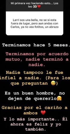 Larissa por primera vez habló sobre el tema y aceptó que la relación con el seleccionado Nacional llegó a su fin hace cinco meses, asegurando que dar por finalizada la relación fue de mutuo acuerdo y no por infidelidad de uno de ellos, como se rumoró días atrás. Hasta ahora, ella había manejado la situación con hermetismo y no había emitido declaraciones en su cuenta oficial, pero la presión genera por su fanáticos hizo que la bella modelo hablará sobre su relación sentimental.