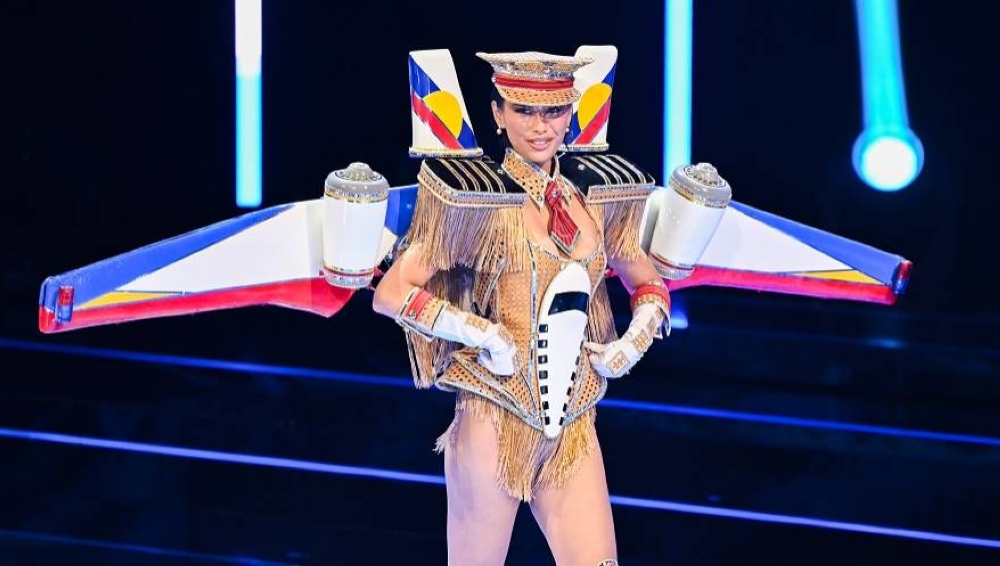 El traje de Michelle emulaba a un avión de la Fuerza Aérea filipina, con los colores de su bandera y pregonando el actual eslogan para el turismo de ese país: "Love The Philippines".