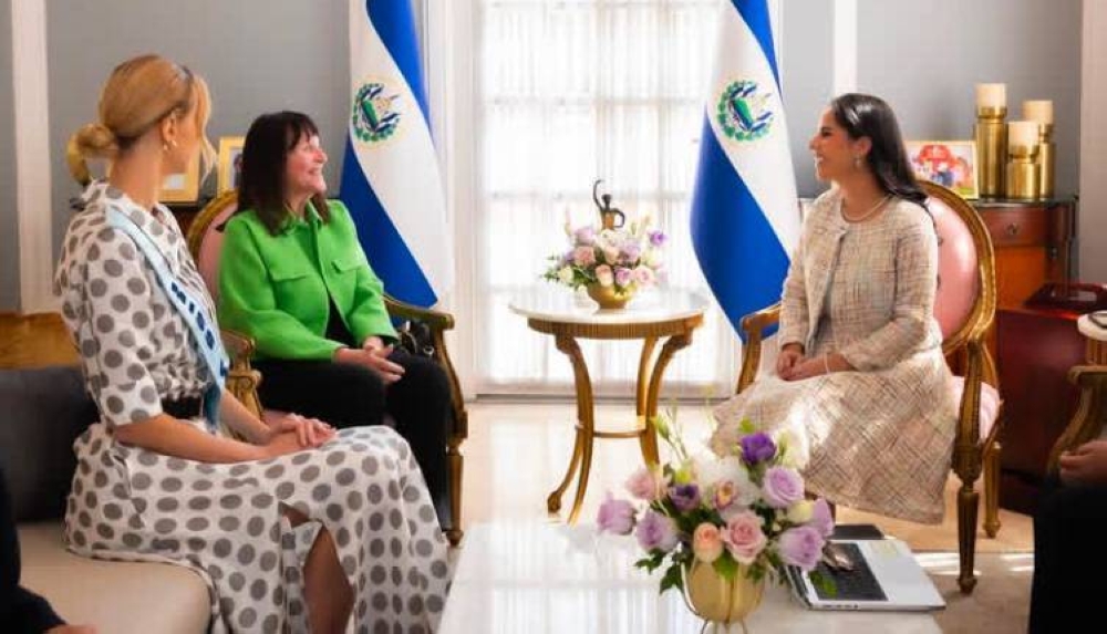 En otro momento también acompañó a la presidenta y CEO de Miss Mundo, la exmodelo y empresaria británica Julia Morley, para una reunión en Casa Presidencial con la primera dama de la República Gabriela de Bukele.