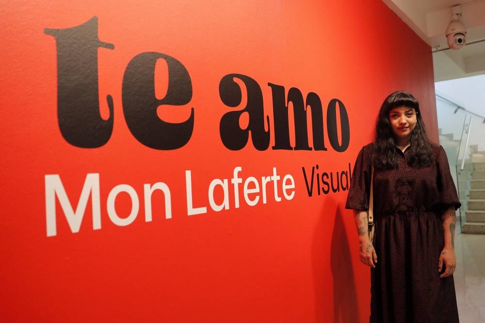 La cantautora mexicana de origen chileno Mon Laferte posa para una foto en la entrada de su exposición "Te amo", que reúne fotografías, objetos personales y una colección de pinturas que muestran su faceta menos conocida como artista, en el Gabriel Centro Cultural Mistral (GAM) en Santiago, Chile / AFP