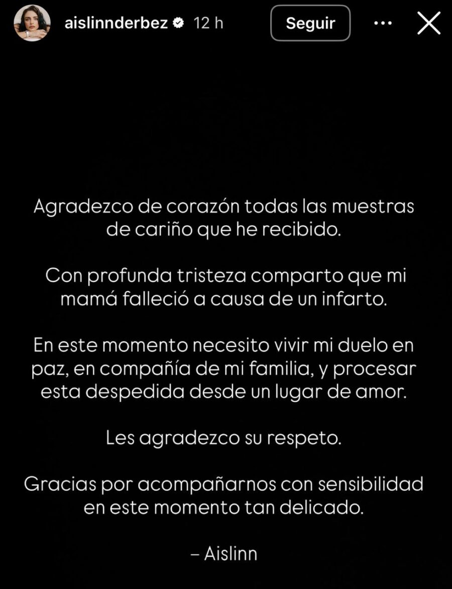 Poco después, Aislinn publicó una historia en su Instagram, donde agradecía el respeto y pedía vivir este duelo y momento delicado en paz, aclarando además que su madre falleció "a causa de un infarto", con 65 años de edad.