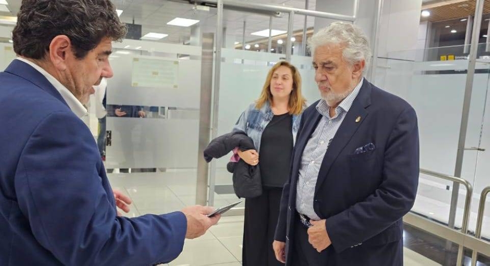 El tenor y su comitiva arribaron la noche de este domingo a El Salvador. En la foto, le acompaña la soprano María José Siri y su hijo Plácido Jr.